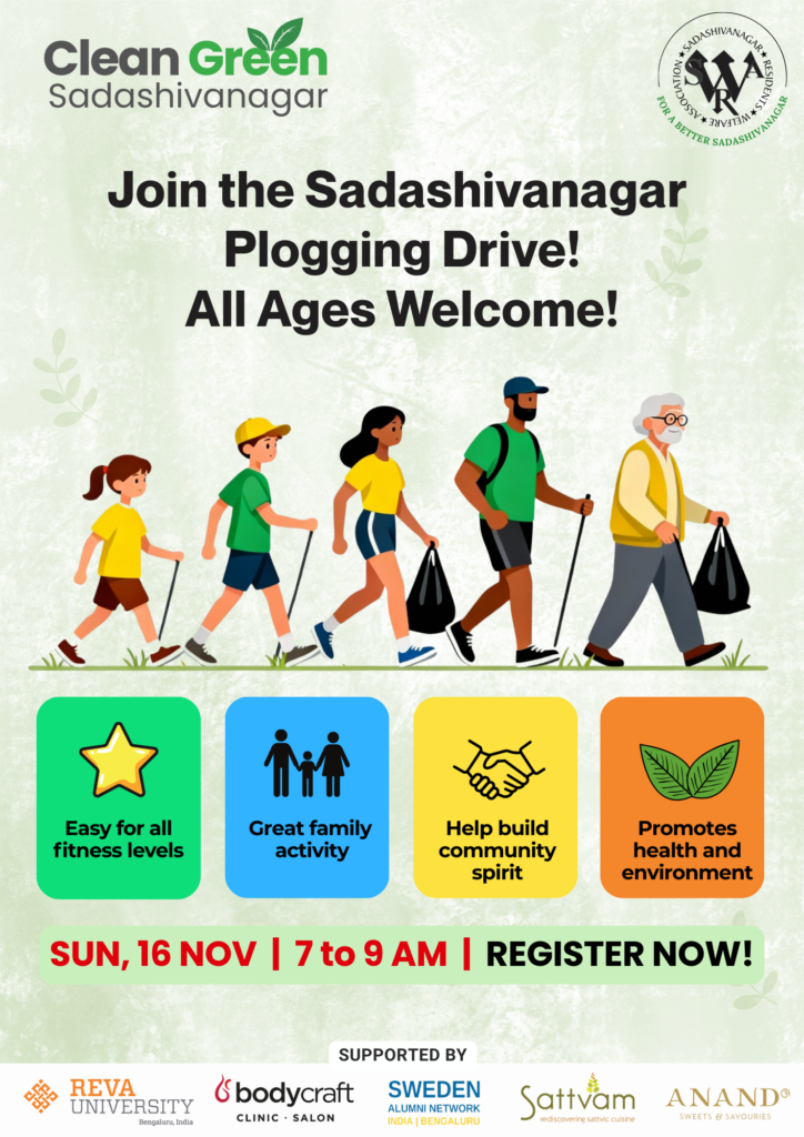 Participants included residents from across Sadashivnagar, runners and walkers communities, students from HKES College and Poorna Pranya School, representatives from Reva University, and teams from Sattvam, Bodycraft and the Sweden Alumni Network. Composting changemakers from Malleshwaram also joined the effort.