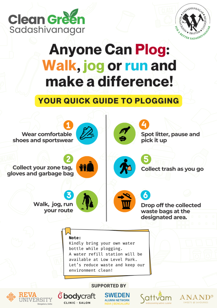 Sadashivnagar was divided into six zones, each led by a designated lead. Participants were allocated zones and began plogging, walking or jogging while collecting waste.